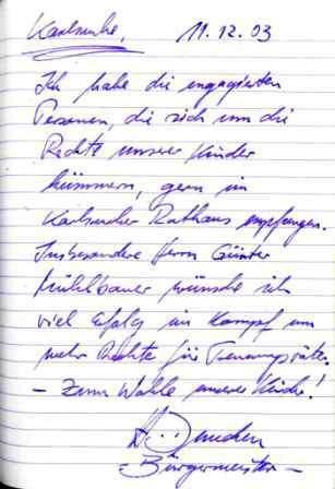 Eintrag des Karlsruher Bürgermeisters Harald Denecken ins Buch der Trennungsväter | |