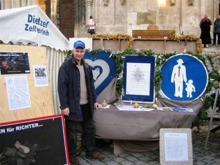 Advent am Dom Erneut hat der Verein Trennungsväter e. V. vom 8.12. bis 10.12.2006 mit einem Info- und Fotostand am Advent am Dom teilgenommen. Interessierte konnten sich trotz des durchwegs schlechten Wetters auch heuer wieder ein Bild von der traurigen und tragischen Situation von Trennungskindern und Trennungsvätern machen, die von Seiten der Politik und/oder Jugendämtern teilweise unmenschlicher Vorgehensweise in Sachen Umgangsrechte ausgesetzt sind. Gerade jetzt zu Weihnachten rückt die Trennung voneinander bei den Kindern und Vätern wieder besonders stark ins Bewusstsein. Unbarmherzig werden beide damit konfrontiert und müssen eine weitere Adventszeit und einen weiteren Hl. Abend ohne einander verbringen. Wie weh das tut? Das wissen nur die, die das selbst erleben und erleiden müssen. Politiker hingegen belügen uns gerade in der Weihnachtszeit vermehrt, indem sie mit ihrem „nicht vorhandenen Herz für Kinder“ ihre „nicht vorhandene Bereitschaft für das Kindeswohl“ zwecks persönlicher Imageaufwertung missbrauchen und uns vorheucheln. Am 10. Dezember vor 3 Jahren überreichten „Trennungsväter“ Blumen an Richter am europäischen Gerichtshof für Menschenrechte in Strasssbourg, die unseren Kindern Rechte zugesprochen haben, welche deutsche Richter den Kindern (noch) nach wie vor verwehren. Väter, vor allem ledige Väter klagen gegen die Rechtssprechung deutscher Familien-Richter und bekommen vor dem Europäischen Gerichtshof in Strassbourg recht. Richter am Bundesverfassungsgericht in Karlsruhe heben diese Urteile auf. „Urteile des Europäischen Gerichtshofes für Menschenrechte sind für deutsche Gerichte nicht zwingend, das deutsche Grundgesetz hat Vorrang.“ § 1684 BGB sagt aber: „Das Kind hat das Recht auf Umgang mit jedem Elternteil; jeder Elternteil ist sogar zum Umgang verpflichtet!“ Den Ausklang fand der „Advent am Dom“ in Form einer Meditation, welche auf unserer Kunstausstellung basierte, mit der wir bereits beim Bundespräsidenten in Berlin und auch schon im Bayerischen Fernsehen vertreten waren – zudem begann damit unsere Aktion von Vater zu „Vater“ in Regensburg. Vorgetragen wurde die Meditation vom Regionalgruppenleiter Regensburg – Johannes Gleitsmann