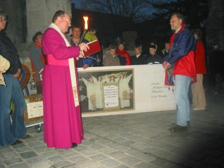 Fackelmarsch vom Regensburger Dom zum Wohnhaus von Papst Benedikt XVI Treff- und Ausgangspunkt war der Regensburger Dom. Vom Domplatz aus starteten die Trennungsväter und -mütter ihren Fußmarsch mit Fackeln und der Geburtstagskarte für Papst Benedikt XVI zu dessen Wohnhaus in Regensburg-Pentling. Insgesamt kam diese Aktion bei der Öffentlichkeit sehr gut an - immerhin hatten Passanten die seltene Gelegenheit, auf der überdimensionalen Geburtstagskarte für den Heiligen Vater selbst zu unterschreiben, was auch ausgiebig in Anspruch genommen wurde
