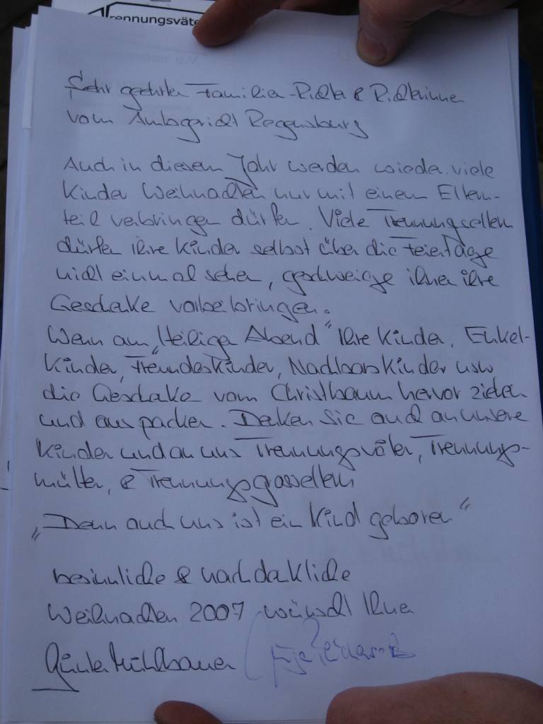 Aktionshinweis: Um auf den Tag der Menschenrechte hinzuweisen, zogen Trennungsväter und -mütter vom Kreisjugendamt in Regensburg mit einem "Streitwagen" und "Papamobil" über das Jugendamt der Stadt Regensburg, vorbei am Regensburger Christkindlmarkt zum Familiengericht - siehe hierzu den entsprechenden Flyer - siehe hierzu einen aktuellen Filmausschnitt - siehe Briefe, die an die verantwortlichen übergeben wurden08.12.2007