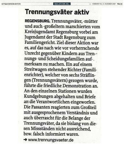 Bericht in der "Mittelbayerischen Zeitung" : "Trennungsväter aktiv" - Bericht über die Aktion am 08.12.2007 in Regensburg10.12.2007