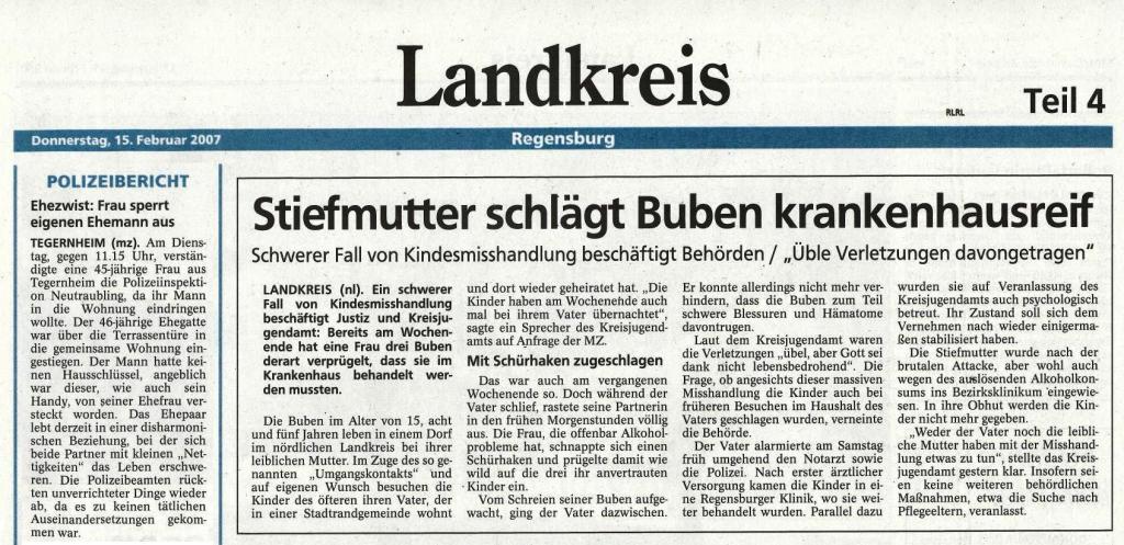 Bericht in der "Mittelbayerischen Zeitung" : "Stiefmutter schlägt Buben krankenhausreif" -schwerer Fall von Kindesmisshandlung beschäftigt Behörden - soviel wieder einmal zu der nach wie vor vorherrschenden Aussage von Frauenhäusern, Jugendämtern und Familiengerichten: "Frauen sind für Kindererziehung besser geeignet als Männer" - siehe hierzu auch13.02.2007