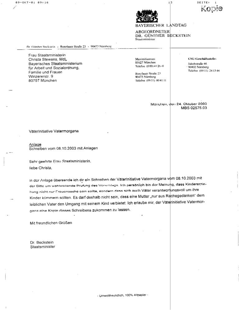 Antwortschreiben des Bayerischen Staatsministeriums für Arbeit und Sozialordnung, Familie und Frauen bezüglich unseres offenen Briefes an den Bayerischen Ministerpräsidenten19.11.2007