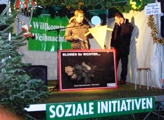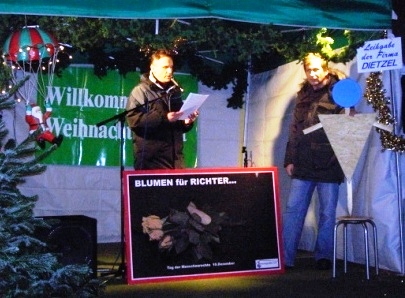 Advent am Dom Erneut hat der Verein Trennungsväter e. V. vom 8.12. bis 10.12.2006 mit einem Info- und Fotostand am Advent am Dom teilgenommen. Interessierte konnten sich trotz des durchwegs schlechten Wetters auch heuer wieder ein Bild von der traurigen und tragischen Situation von Trennungskindern und Trennungsvätern machen, die von Seiten der Politik und/oder Jugendämtern teilweise unmenschlicher Vorgehensweise in Sachen Umgangsrechte ausgesetzt sind. Gerade jetzt zu Weihnachten rückt die Trennung voneinander bei den Kindern und Vätern wieder besonders stark ins Bewusstsein. Unbarmherzig werden beide damit konfrontiert und müssen eine weitere Adventszeit und einen weiteren Hl. Abend ohne einander verbringen. Wie weh das tut? Das wissen nur die, die das selbst erleben und erleiden müssen. Politiker hingegen belügen uns gerade in der Weihnachtszeit vermehrt, indem sie mit ihrem „nicht vorhandenen Herz für Kinder“ ihre „nicht vorhandene Bereitschaft für das Kindeswohl“ zwecks persönlicher Imageaufwertung missbrauchen und uns vorheucheln. Am 10. Dezember vor 3 Jahren überreichten „Trennungsväter“ Blumen an Richter am europäischen Gerichtshof für Menschenrechte in Strasssbourg, die unseren Kindern Rechte zugesprochen haben, welche deutsche Richter den Kindern (noch) nach wie vor verwehren. Väter, vor allem ledige Väter klagen gegen die Rechtssprechung deutscher Familien-Richter und bekommen vor dem Europäischen Gerichtshof in Strassbourg recht. Richter am Bundesverfassungsgericht in Karlsruhe heben diese Urteile auf. „Urteile des Europäischen Gerichtshofes für Menschenrechte sind für deutsche Gerichte nicht zwingend, das deutsche Grundgesetz hat Vorrang.“ § 1684 BGB sagt aber: „Das Kind hat das Recht auf Umgang mit jedem Elternteil; jeder Elternteil ist sogar zum Umgang verpflichtet!“ Den Ausklang fand der „Advent am Dom“ in Form einer Meditation, welche auf unserer Kunstausstellung basierte, mit der wir bereits beim Bundespräsidenten in Berlin und auch schon im Bayerischen Fernsehen vertreten waren – zudem begann damit unsere Aktion von Vater zu „Vater“ in Regensburg. Vorgetragen wurde die Meditation vom Regionalgruppenleiter Regensburg – Johannes Gleitsmann